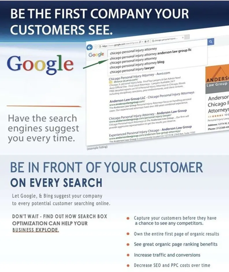 Search Box Optimization (SBO) is the solution! It’s quicker, more budget-friendly, and more reliable than conventional SEO – ensuring your clients land on a page of search results solely focusing on your enterprise.